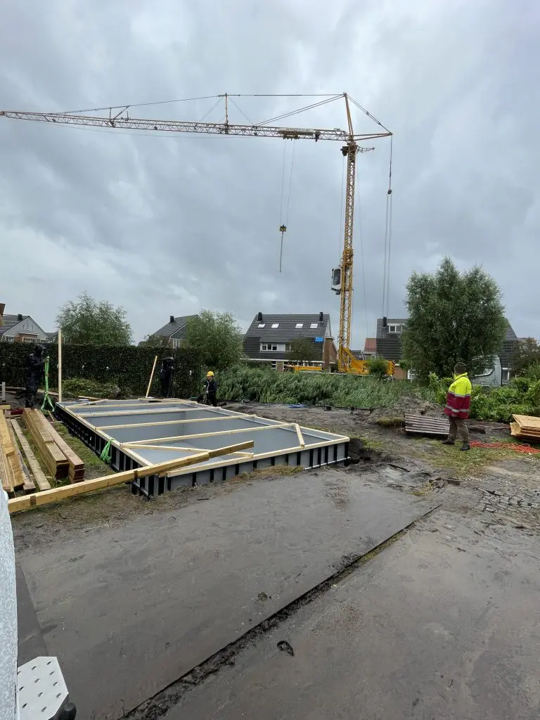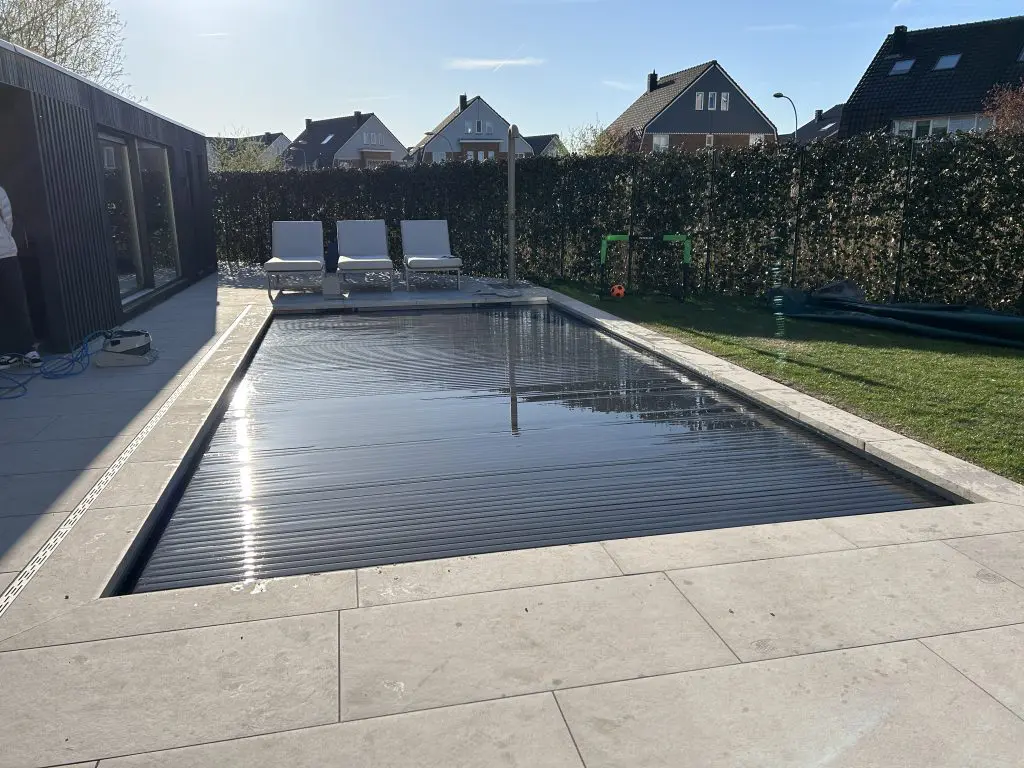 HDPE rechte hoektrap met 3 treden, 70 cm breed, geplaatst tegen HDPE nis welke teven dient als 1e trede van de trap