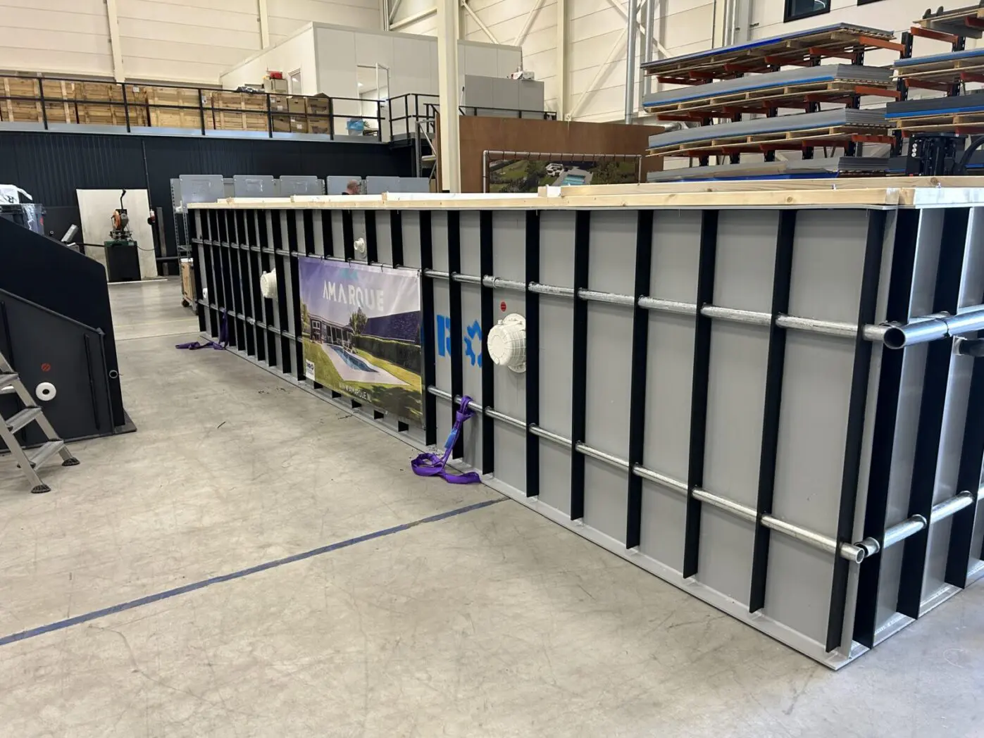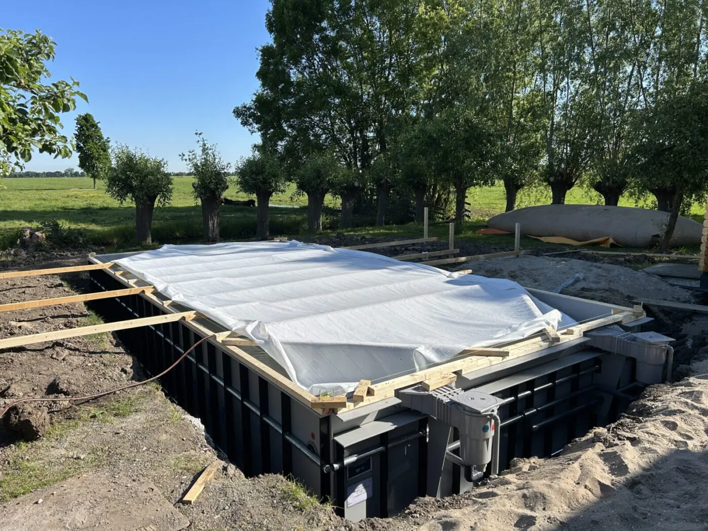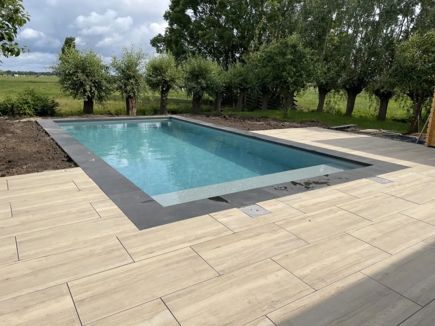 Kunststof HDPE rechte hoektrap met 3 treden, geplaatst tegen HDPE nis/plage, welke tevens dient als 1e trede van de trap